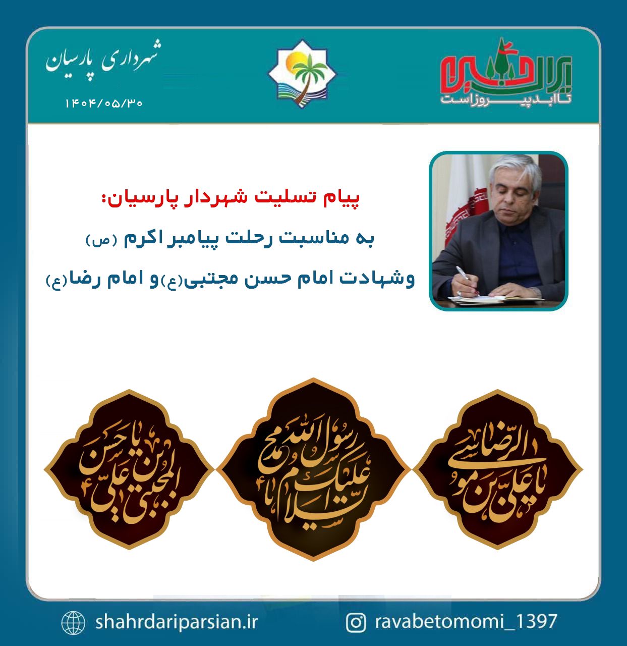 پیام تسلیت شهردار پارسیان به مناسبت رحلت پیامبر اکرم (ص) و شهادت امام حسن مجتبی (ع) و امام رضا (ع)