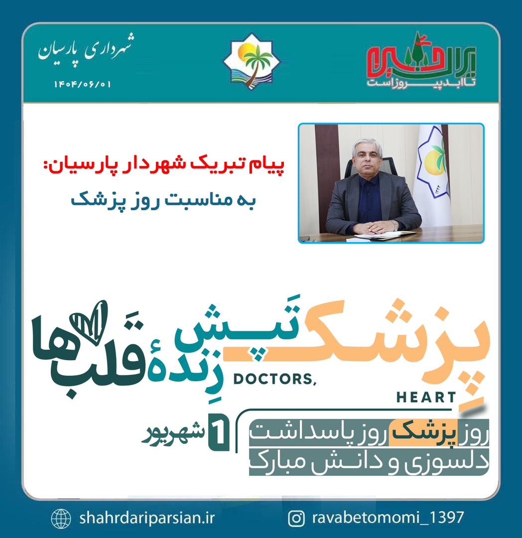 اینجانب این روز فرخنده را به همه پزشکان شریف، فرهیخته و دلسوز شهر پارسیان صمیمانه تبریک عرض می‌نمایم و از زحمات ارزشمند و خدمات صادقانه آنان در مسیر ارتقای سطح سلامت و آرامش شهروندان عزیز قدردانی می‌کنم.