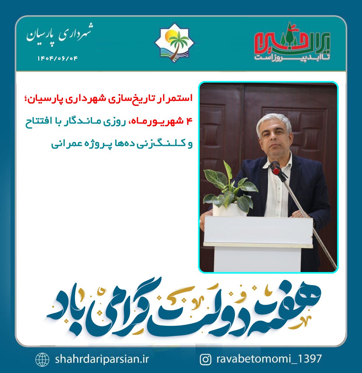یکشنبه, 03 شهریور 1404 پیام تبریک شهردار پارسیان به مناسبت هفته دولت بسم الله الرحمن الرحیم هفته دولت...