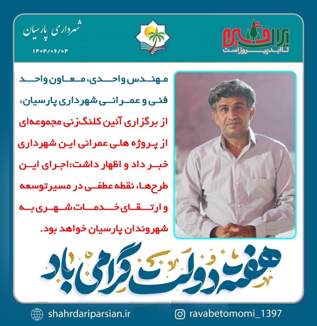 مهندس واحدی، مسئول واحد فنی شهرداری پارسیان، از برگزاری آئین کلنگزنی مجموعهای از پروژههای عمرانی این شهرداری خبر داد و اظهار داشت: اجرای این طرحها، نقطه عطفی در مسیر توسعه و ارتقای خدمات شهری به شهروندان پارسیان خواهد بود.