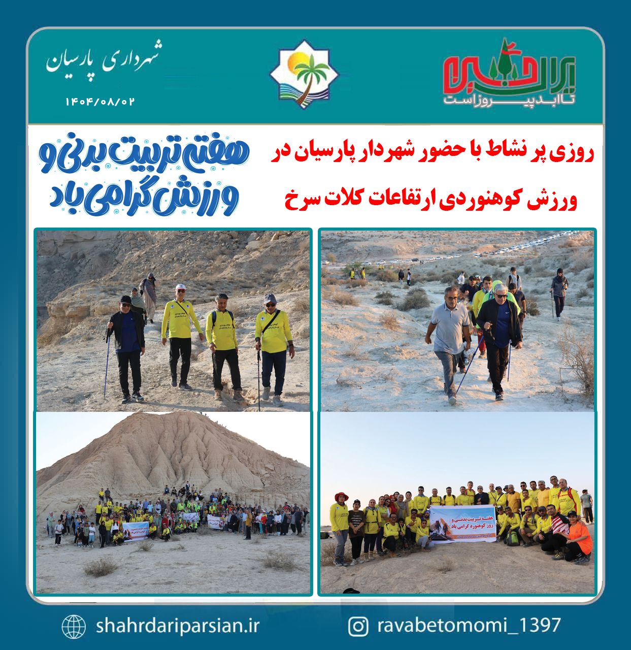صبحی سرشار از انرژی و نشاط در ارتفاعات زیبای کلات سرخ شهرستان پارسیان رقم خورد؛ جایی که جمعی از ورزش‌دوستان، کوهنوردان و علاقه‌مندان به طبیعت، در قالب برنامه‌ای به مناسبت هفته تربیت بدنی و ورزش، گرد هم آمدند.