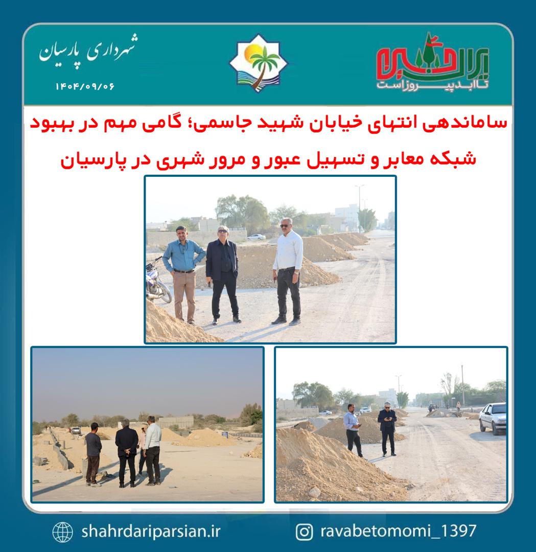 به گزارش روابط عمومی شهرداری پارسیان، با تلاش‌های مستمر مجموعه مدیریت شهری و پیگیری‌های میدانی، انتهای خیابان ۳۰ متری شهید جاسمی پس از سال‌ها ، بازگشایی شد. این اقدام که با هدف رفع نقطه حادثه خیز و افزایش ایمنی، روان‌سازی تردد و ارتقای دسترسی‌های شهری انجام گرفت، یکی از مطالبات مهم شهروندان ساکن این محور محسوب می‌شد.