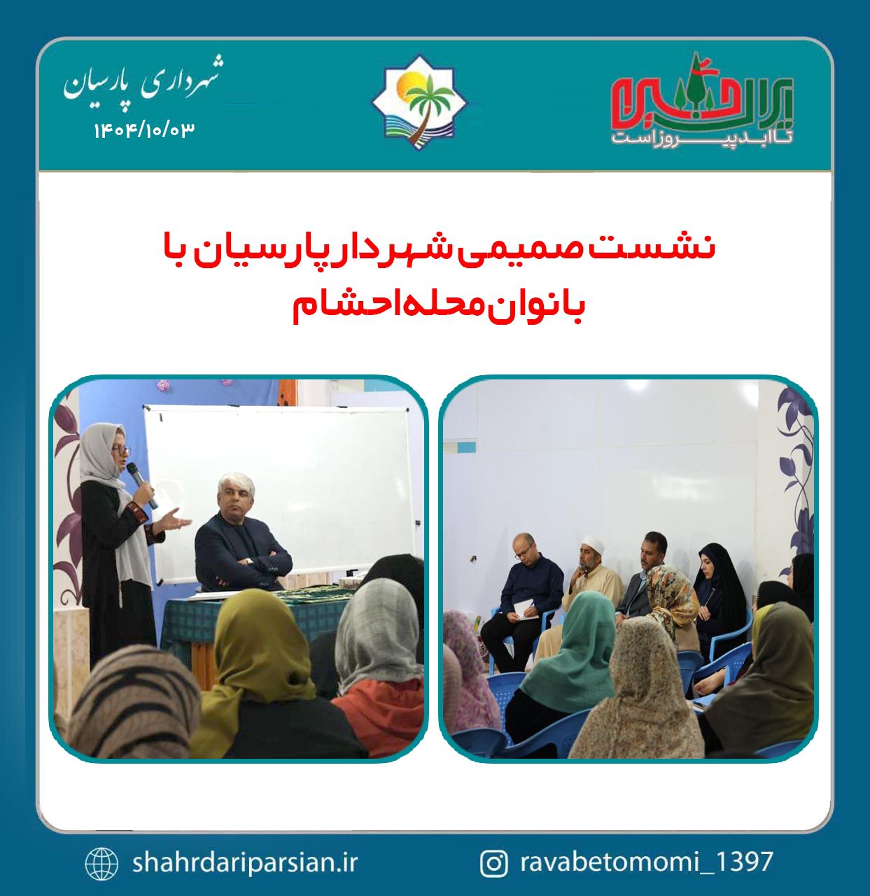 نشست صمیمی مهندس سالمي شهردار پارسيان به همراه اعضای محترم شورای شهر با جمعی از بانوان محله احشام با هدف بررسی مسائل و مشکلات این محله برگزار شد. در این دیدار، بانوان محله احشام به بیان دغدغه‌ها و مطالبات خود پیرامون فضای سبز ، روشنایی خیابان وضعیت پارک‌ها، آسفالت کوچه‌ها و معابر محلی پرداختند و خواستار رسیدگی و بهبود شرایط موجود شدند.